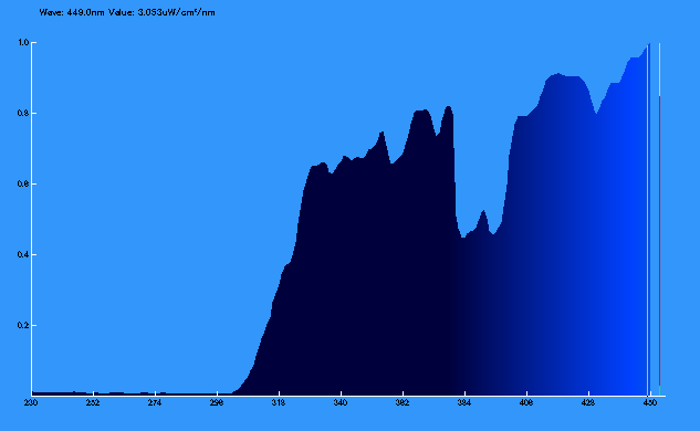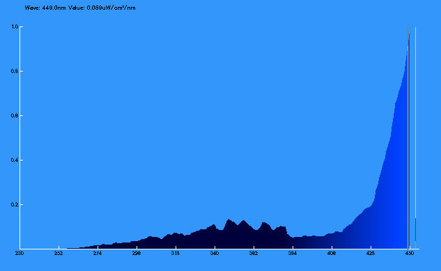 こちらは日陰ではありますが、昼12時台の太陽光です。UVB・UVA・HEV領域まで、幅広い波長が含まれていることが確認できます。