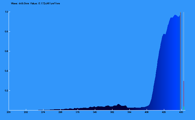 分光器が拡散光を拾っている影響か、完全にゼロにはなっていませんが、約430nmまでの短波長の光が大きく減衰していることがわかります。